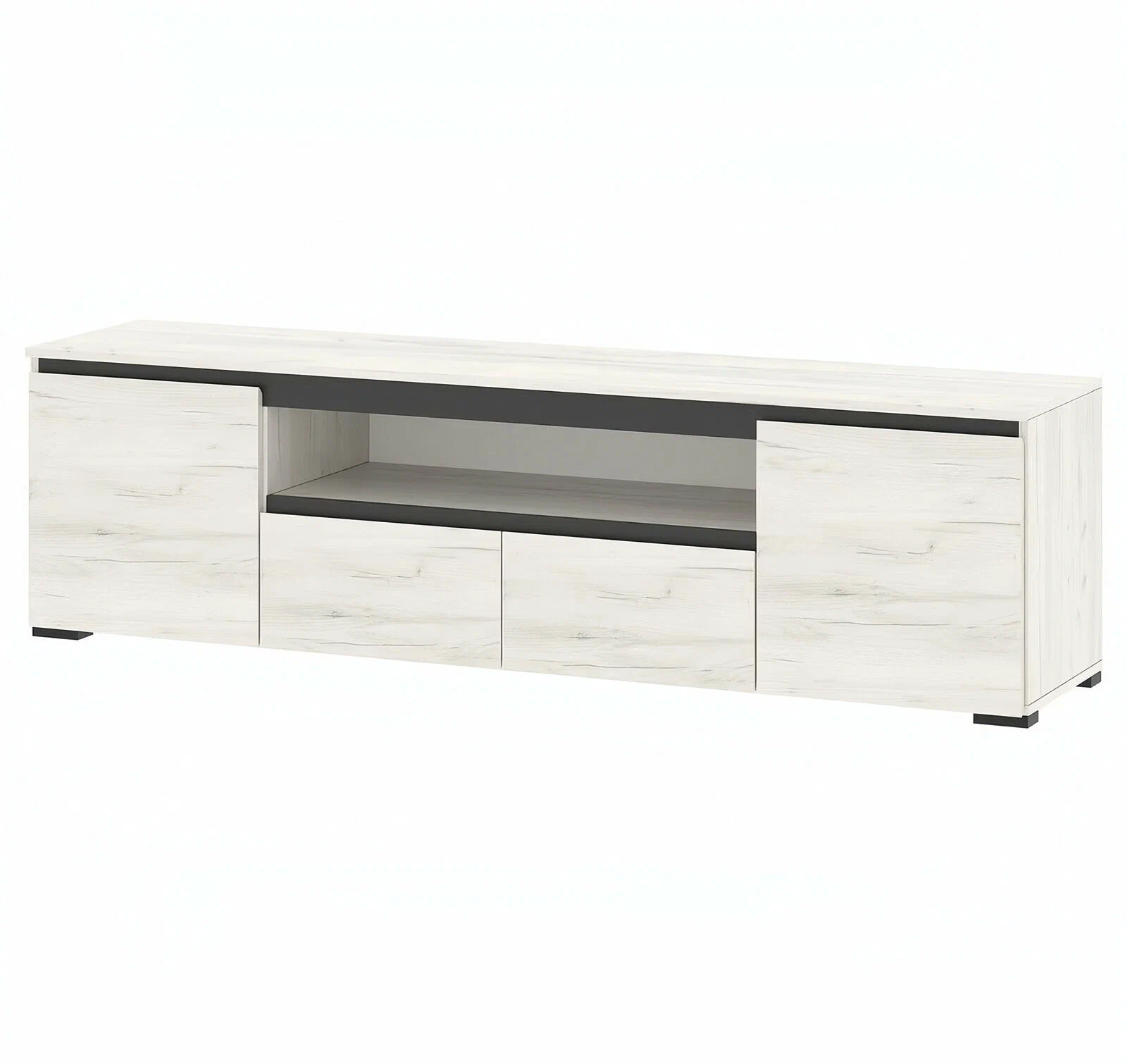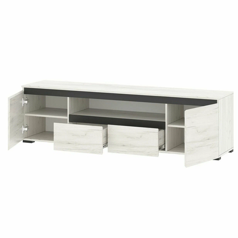 • Комбинированное хранение: Тумба оснащена двумя распашными отделениями и двумя выдвижными ящиками, а также открытой нишей для размещения аппаратуры или декора.