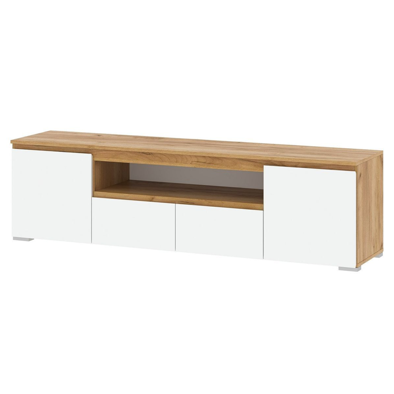 • Комбинированное хранение: Тумба оснащена двумя распашными отделениями и двумя выдвижными ящиками, а также открытой нишей для размещения аппаратуры или декора.