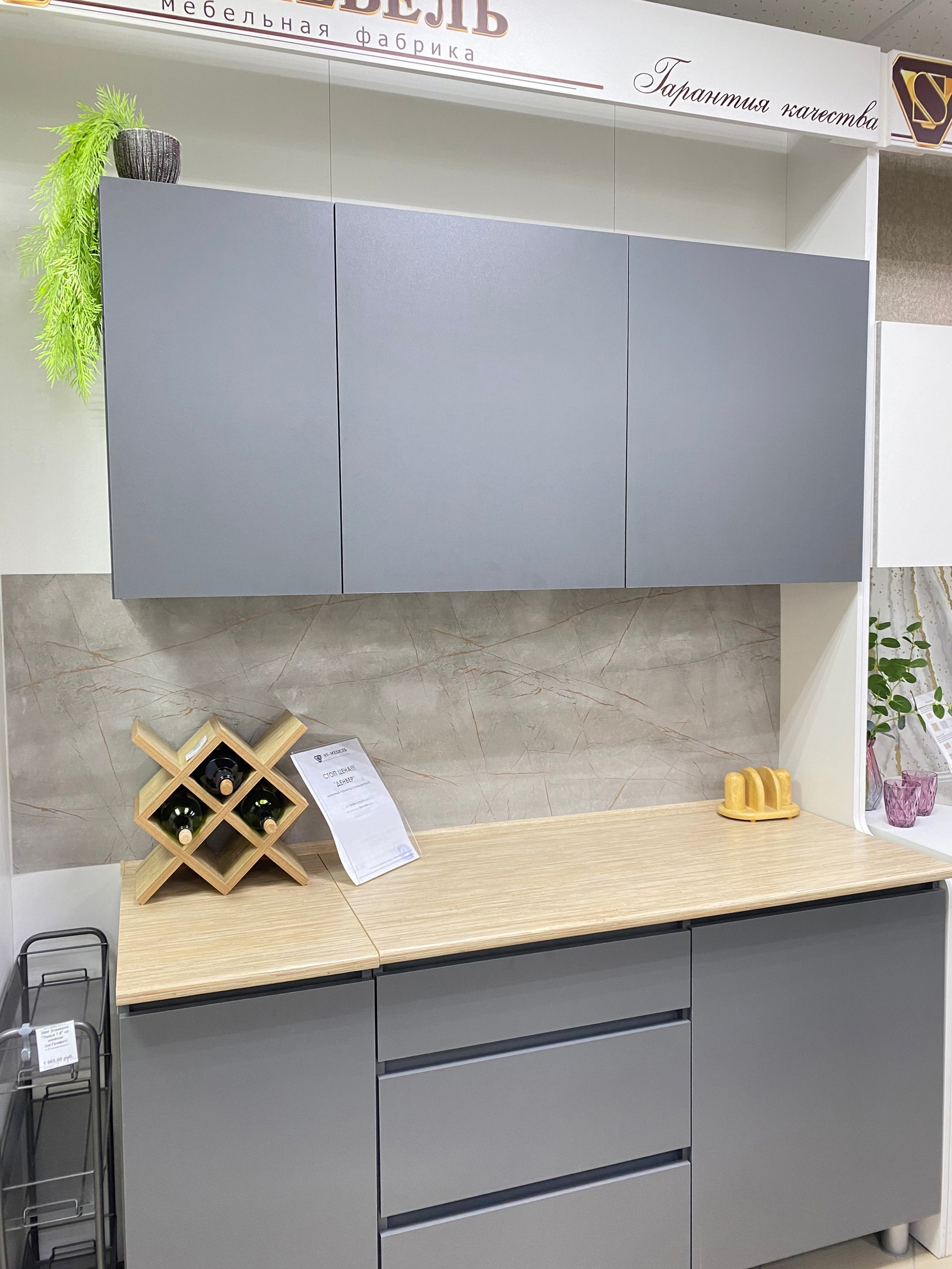 Фасады шкафов и столов не имеют ручек и скосов. Открывание шкафов осуществляется за выступающий снизу торец фасада. Кухня имеет цоколя, впереди устанавливаются декоративные опоры. В стоимость не входит мойка, смеситель, посудосушитель.