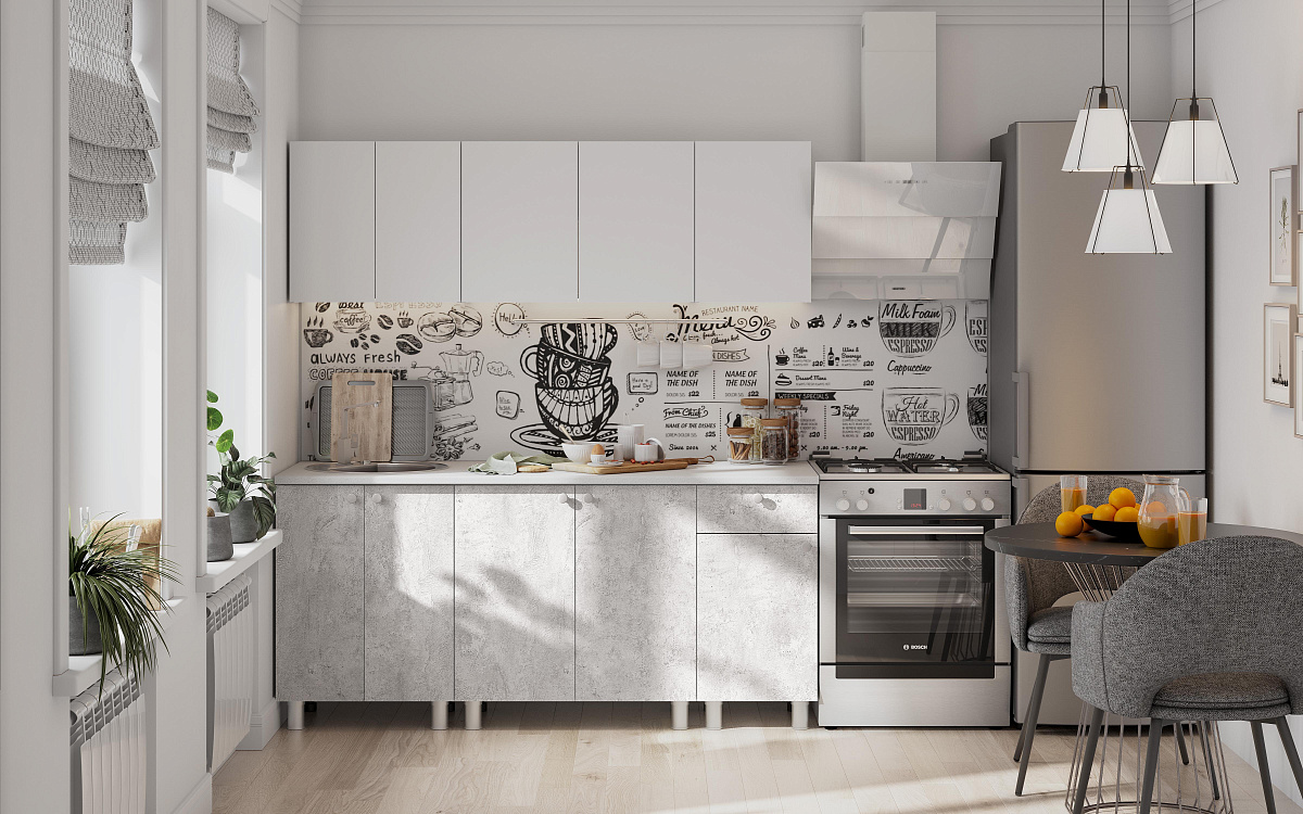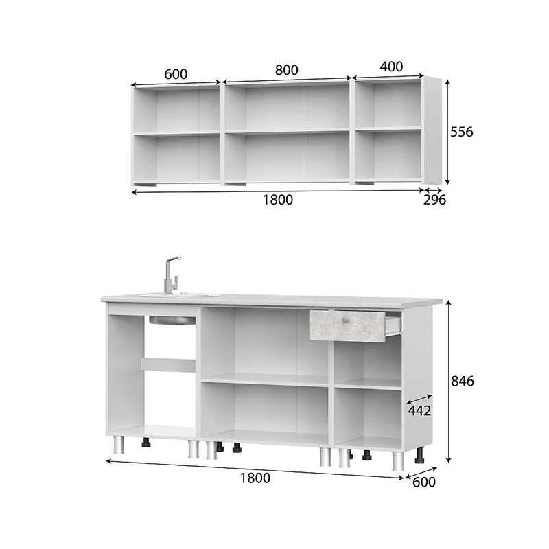 Верх без ручек. Открывание шкафов осуществляется за выступающий снизу торец фасада. Нижние шкафы оснащены ручками-кнопками. В стоимость не входит мойка, смеситель, посудосушитель.