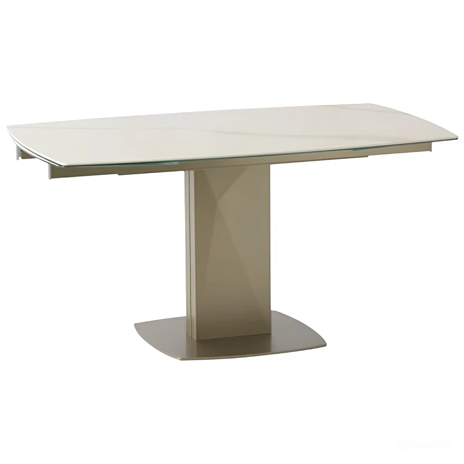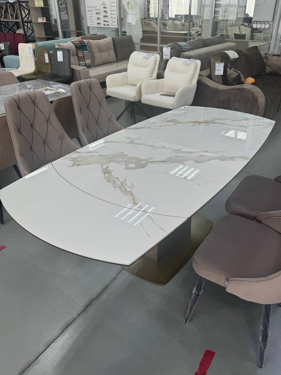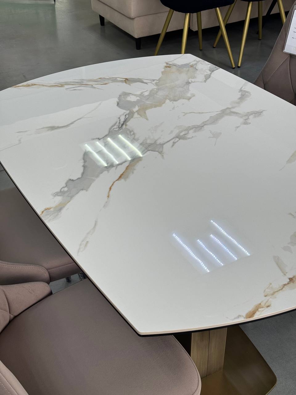 Столешница: Изготовлена из керамики толщиной 6 мм с покрытием из стекла толщиной 6 мм. Белый мраморный глянец придает столу роскошный и современный вид.