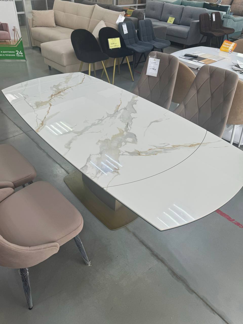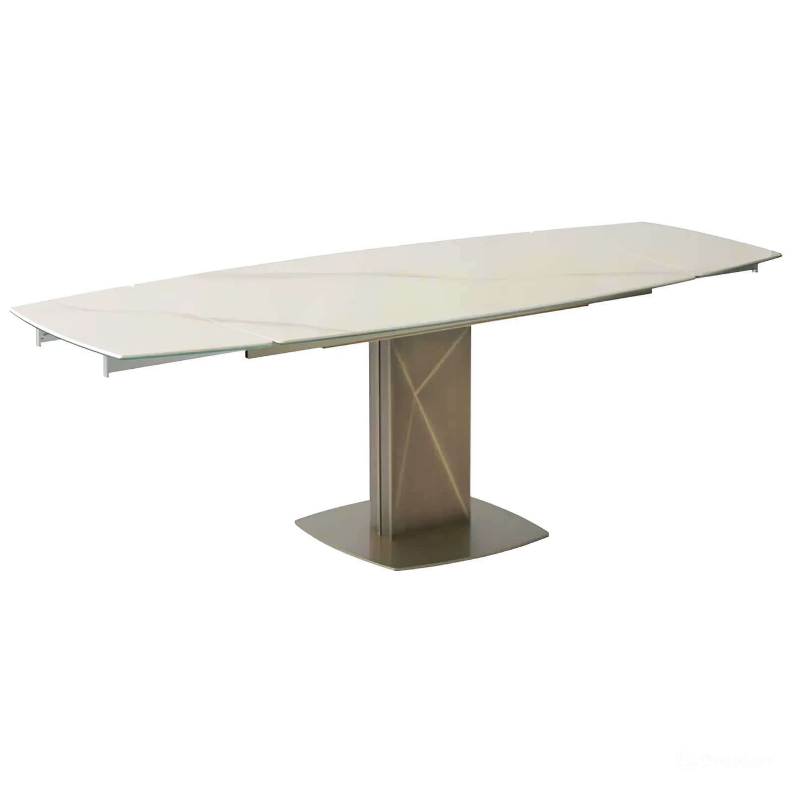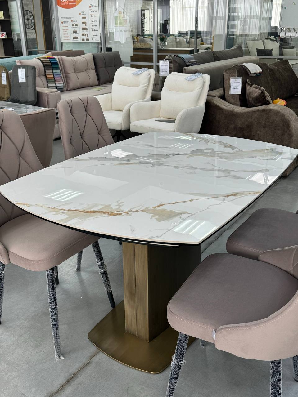 Столешница: Изготовлена из керамики толщиной 6 мм с покрытием из стекла толщиной 6 мм. Белый мраморный глянец придает столу роскошный и современный вид.