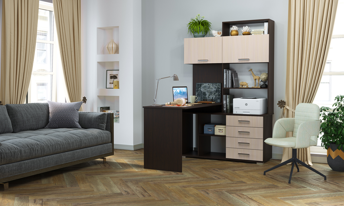 - Удобная конфигурация с полками, ящиками и закрытыми секциями.