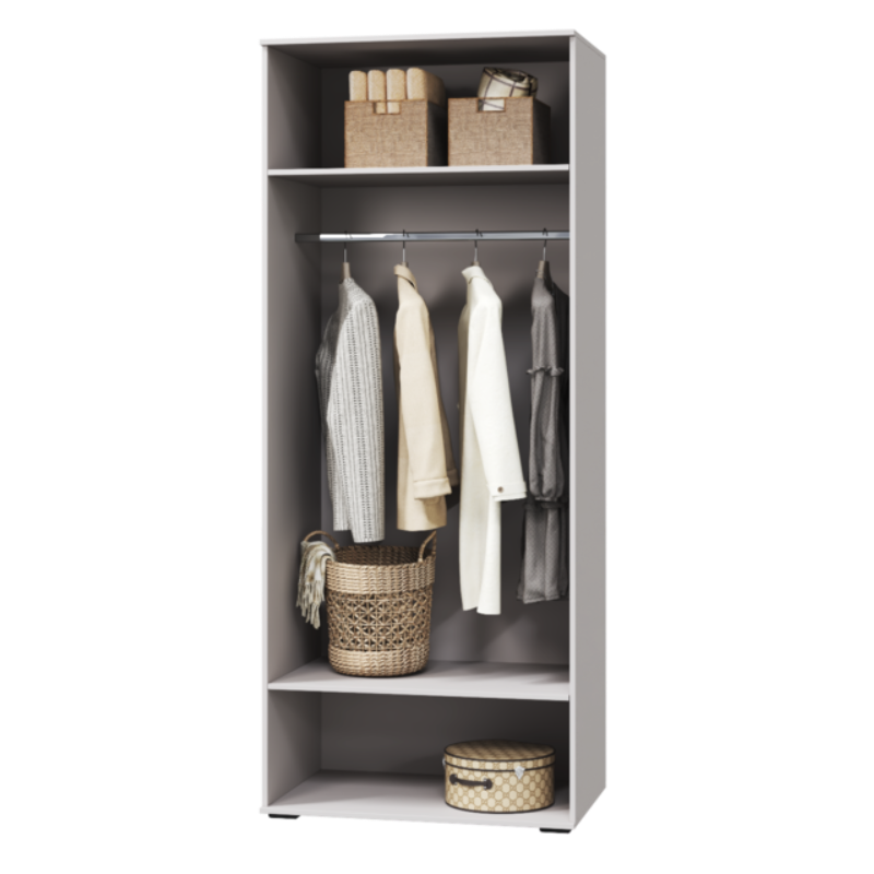 • Внутреннее наполнение включает штангу для одежды и полки.